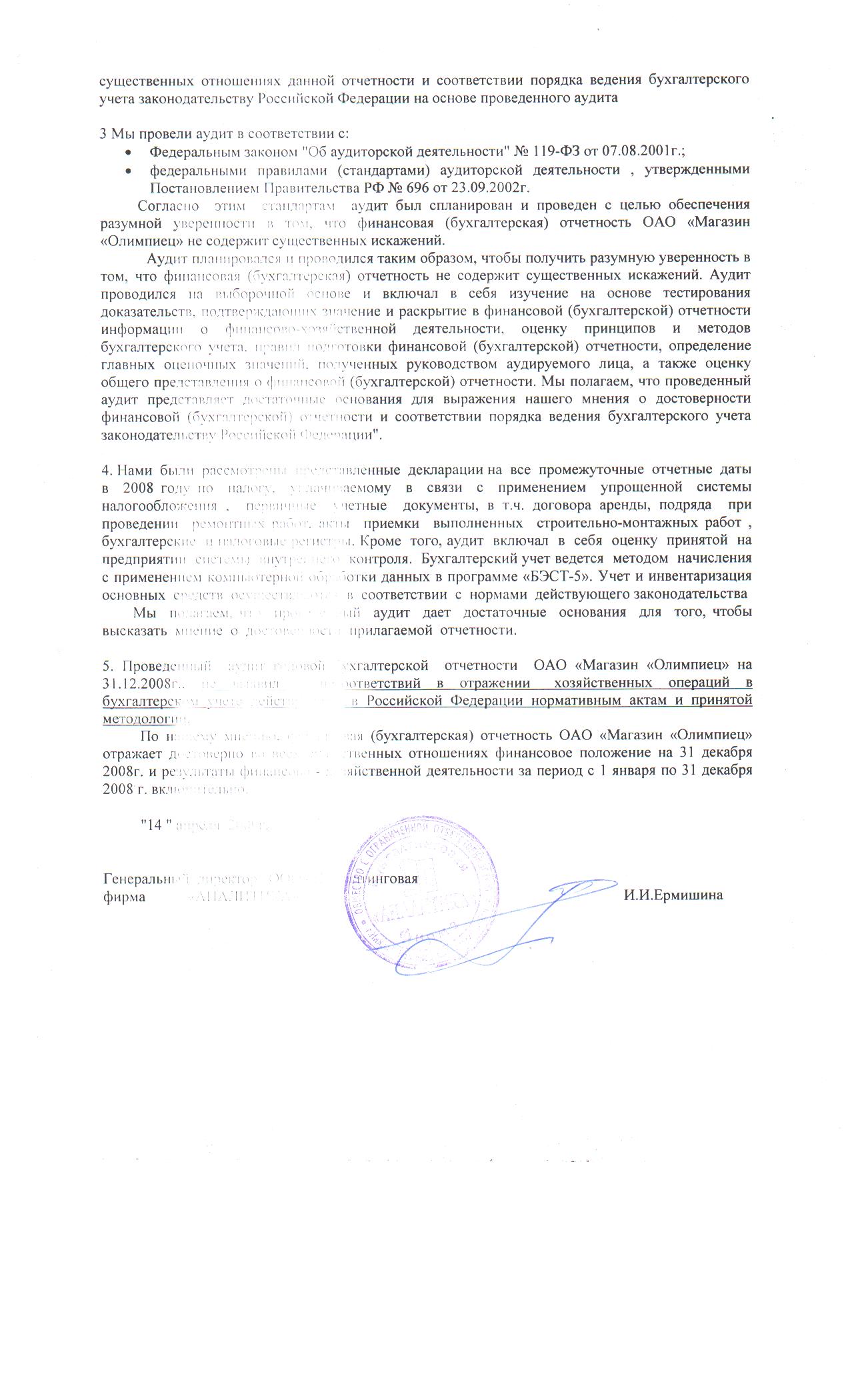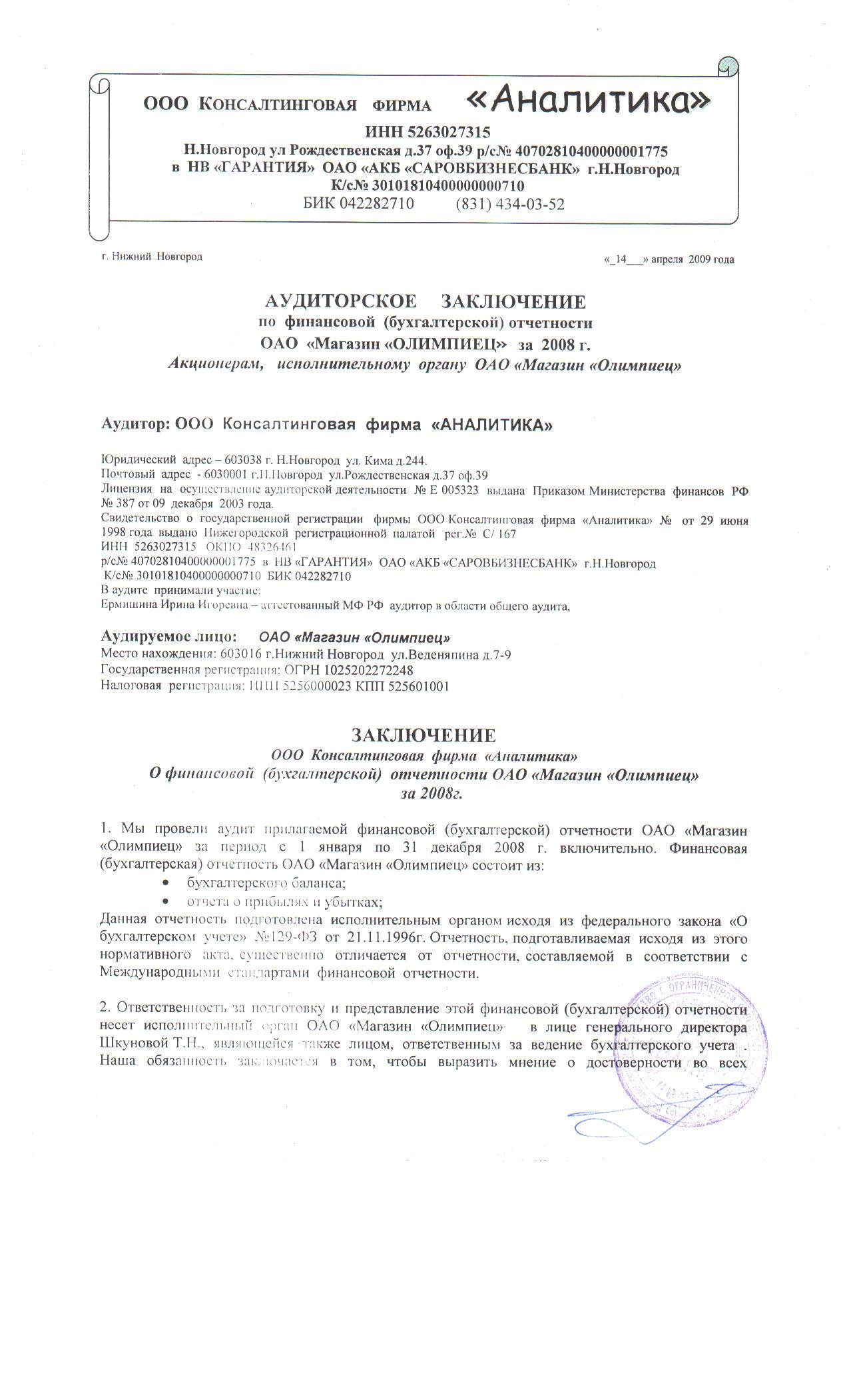 | 20 | АУДИТОРСКОЕ ЗАКЛЮЧЕНИЕ по финансовой (бухгалтерской) отчетностиОАО «Магазин «ОЛИМПИЕЦ» за 2009 г. | АУДИТОРСКОЕ ЗАКЛЮЧЕНИЕ по финансовой (бухгалтерской) отчетностиОАО «Магазин «ОЛИМПИЕЦ» за 2009 г. |